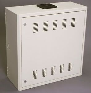 • Houses 19” multimedia cross connect panels and active network equipment in one cabinet • 3u rack space for 19” hubs, UPS etc. • Additional 3u rack space for 19” patch panels that hinges down for front access of terminations • Optional rail placement provides for deeper equipment mounting (28” deep) • Cable entrance points include ½” conduit knockouts and standard WM 4000 raceway entrance on all sides • Secure environment with lock installed on front door • Vented construction provides dissipation of 160 watts without fan • Thermostat, Fan & Filter Kit installed in cabinet bottom (optional top placement) • Door is field reversible from left to right • UL Listed • Powder coated finish • Mounting provisions for duplex electrical box • Multiple cable tie off points for cable management • Multiple mounting holes in rear allow for variances in wall studs when mounting • Ground studs for grounding door to base • Corbin CAT60 lock installed |